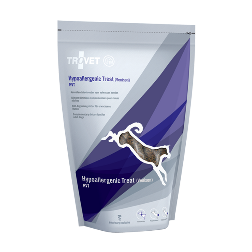 De Trovet Hypoallergenic Treat (Venison) HVT bestaat uit gedroogd, 100% Hert, zonder toevoegingen en is uitstekend inzetbaar bij honden met een (mogelijke) voedselovergevoeligheid naast een hypoallergeen dieet op basis van dezelfde eiwitbron. De treat kan eveneens worden ingezet voor gezonde volwassen honden.