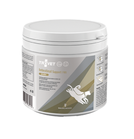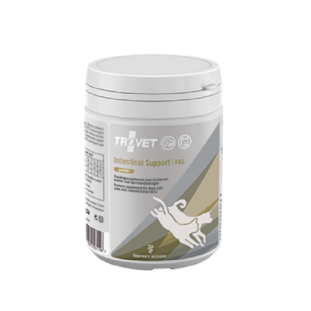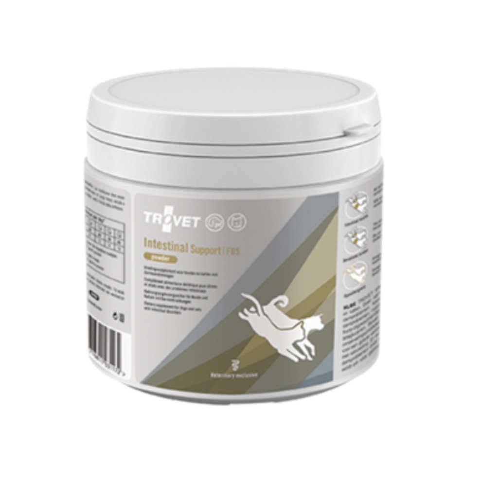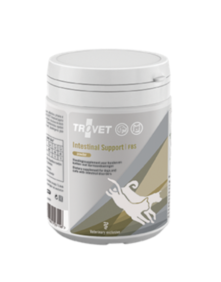 Trovet Intestinal Support FBS is een voedingssupplement, samengesteld om honden en katten met darmproblemen te ondersteunen. Het middels is inzetbaar bij een verstoring van de microflora in de darmen, darmontstekingen door bacteriën en voedselvergiftiging. Hiernaast is het supplement inzetbaar als aanvullende vezelbron bij droogvoeders.