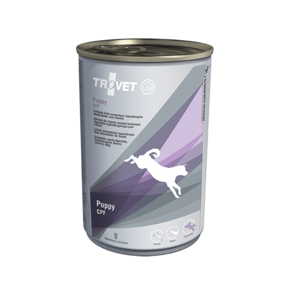 De Trovet Puppy CPF is een volledige diervoeding voor pups van alle rassen. De voeding die u uw pup het eerste levensjaar geeft, is bepalend voor de ontwikkeling tot een volwassen hond. De groei van het jonge dier gaat zeer snel, ook dat van het maagdarmstelsel. Daarom heeft de pup speciale, licht verteer bare voeding nodig die voldoende eiwit en energie bevat. Onderzoek heeft aangetoond dat de voedingsbehoefte van de pup gedurende de gehele groeifase nagenoeg gelijk blijft. Dit betekent dat u de pup gedurende de gehele groeifase Puppy kunt geven. Het streefgewicht van het volwassen dier bepaalt in zekere mate de duur van de groeifase.