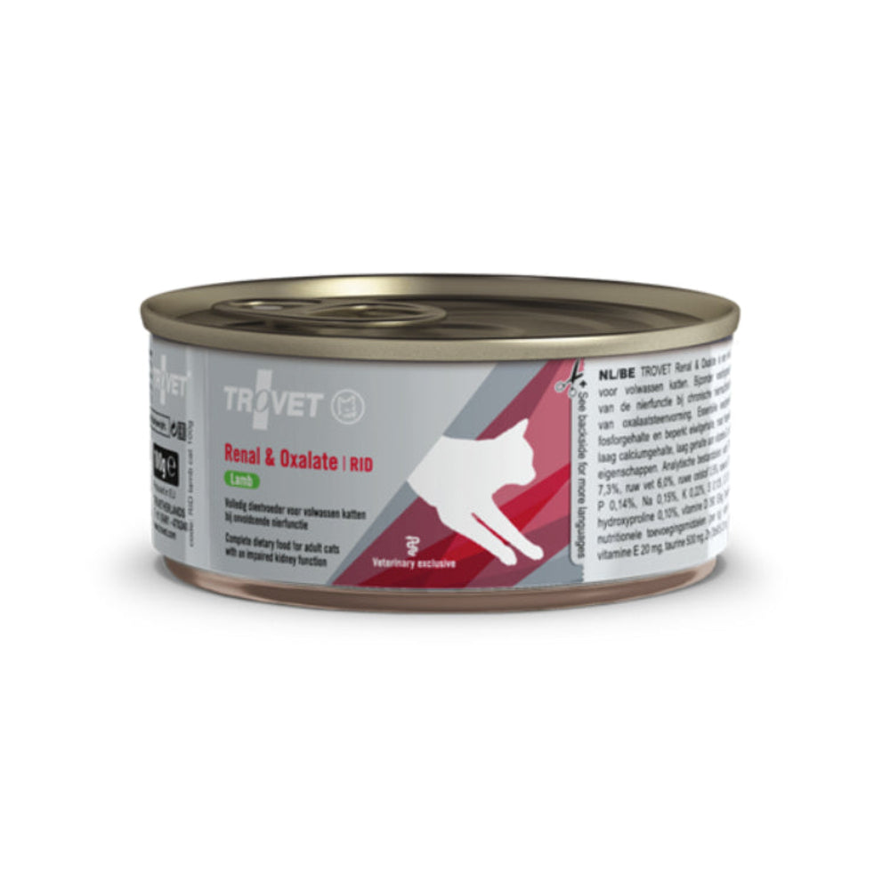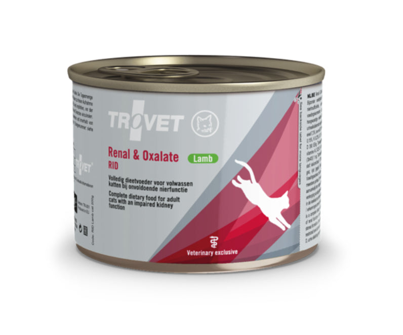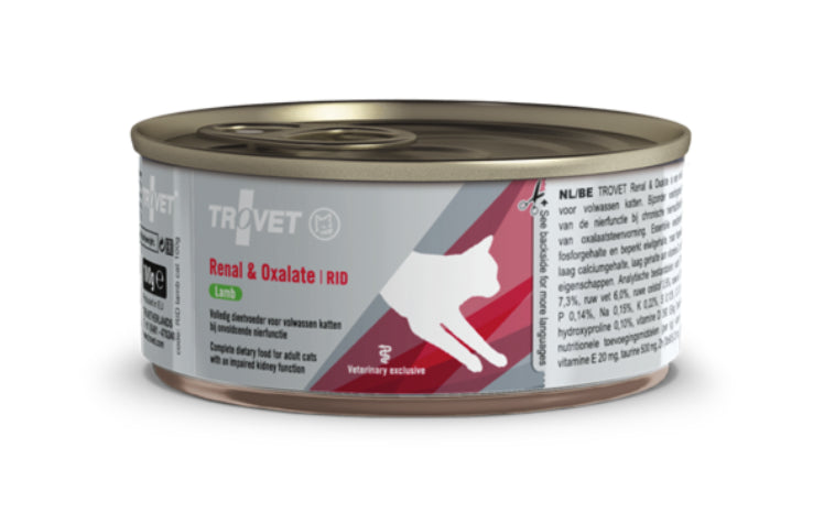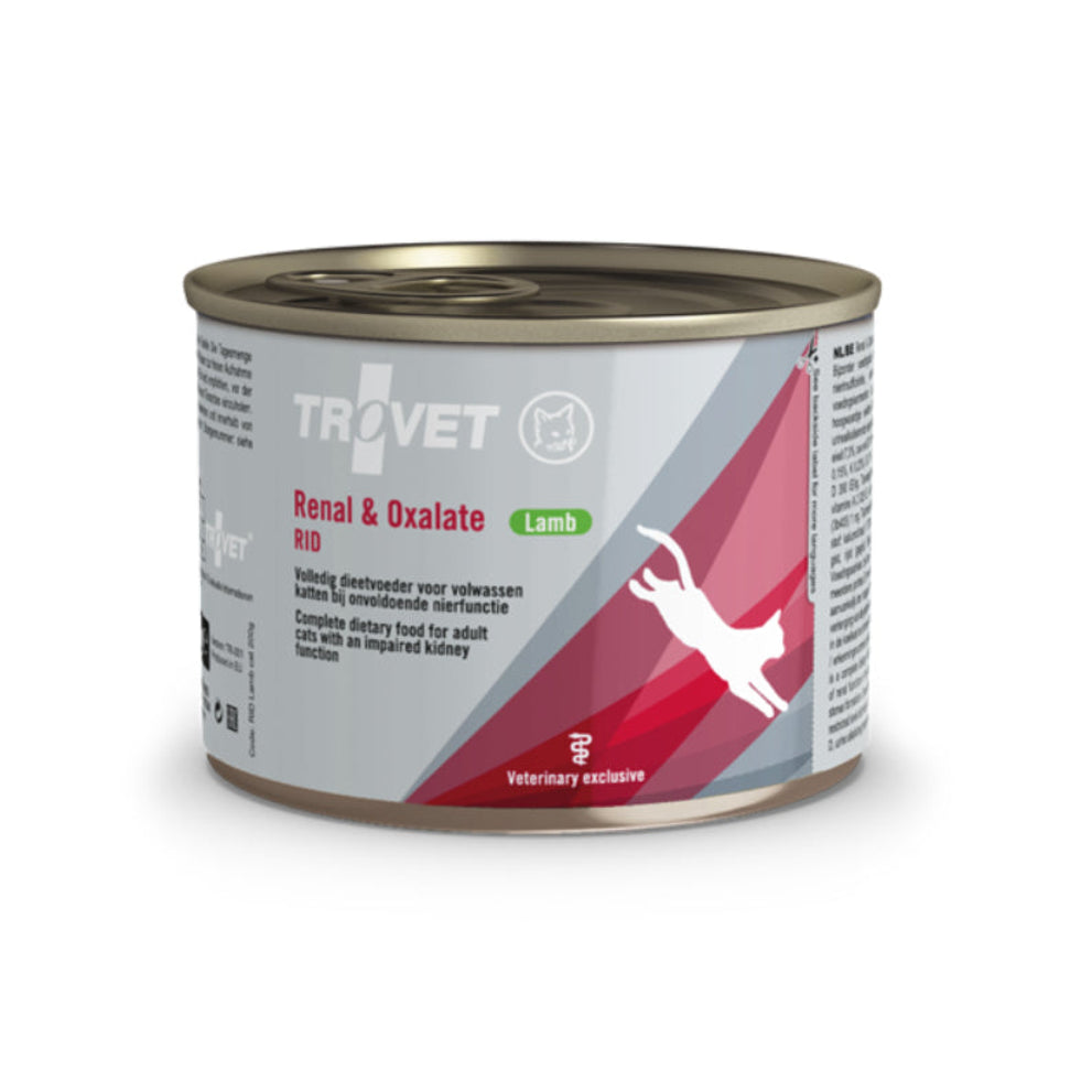 De Trovet Renal & Oxalate RID voeding is een complete dieetvoeding is speciaal afgestemd op de behoefte van katten met chronisch nierfalen. Het bevat een beperkt gehalte aan eiwitten en minder fosfor om belasting van de nieren te beperken. De gebruikte eiwitten zijn van hoge kwaliteit. Daarnaast bevat de Trovet Renal & Oxalate RID extra veel energie, zodat de kat bij een verminderde eetlust een kleinere hoeveelheid hoeft te eten om toch in de dagelijkse energiebehoefte te voorzien.