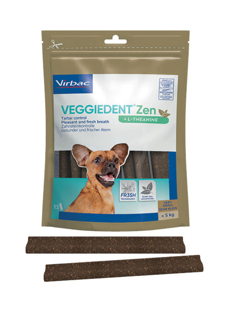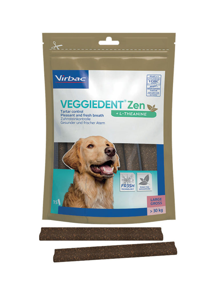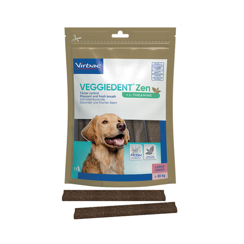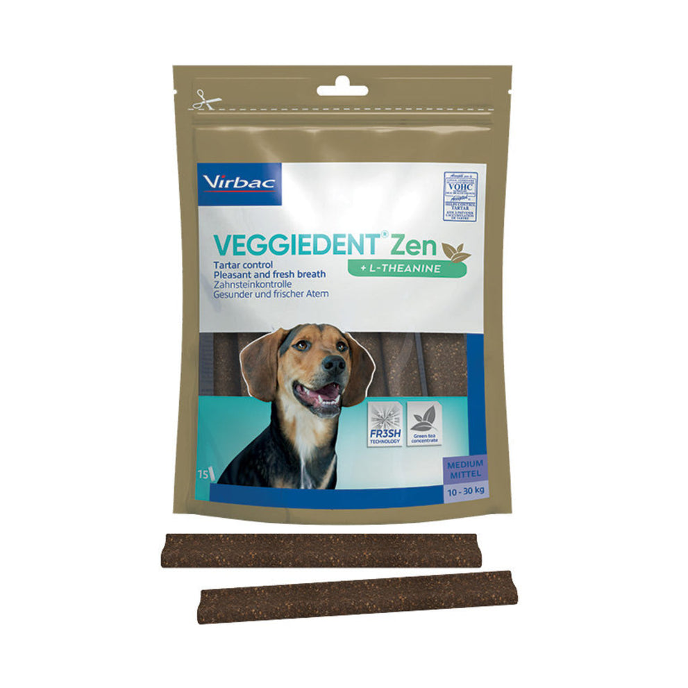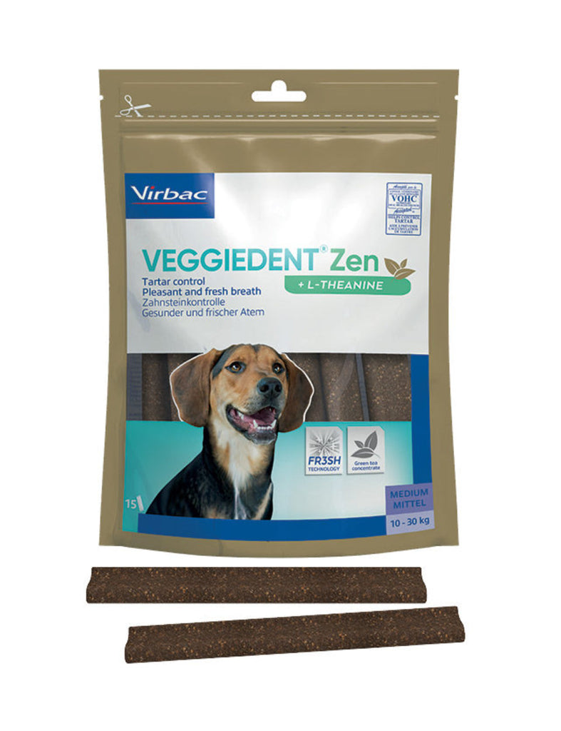 VeggieDent FR3SH Zen is een kauwstrip voor de dagelijkse gebitsreiniging bij honden. Het voorkomt de vorming van tandplak, tandsteen en slechte adem. Daarnaast bevat de Veggiedenkt FR3SH Zen L-theanine. Dit is een aminozuur dat gewonnen wordt uit groene thee. Het vermindert reacties in relatie tot stress en angst en bevordert de leercapaciteit. L-theanine is gekend om zijn ontspannende eigenschappen.