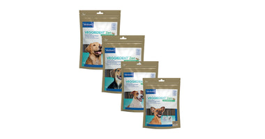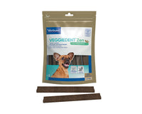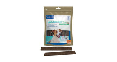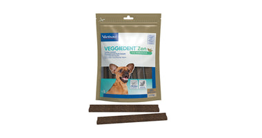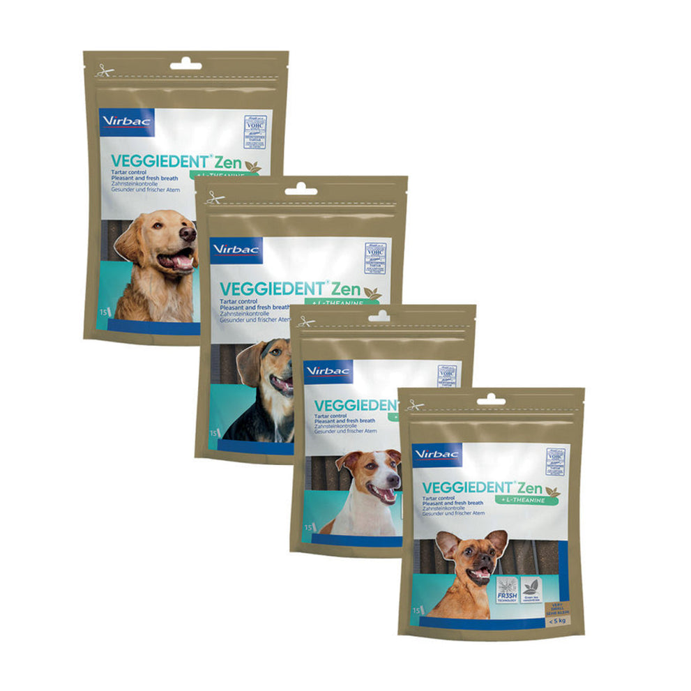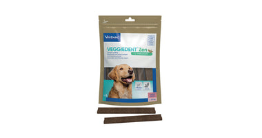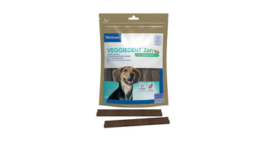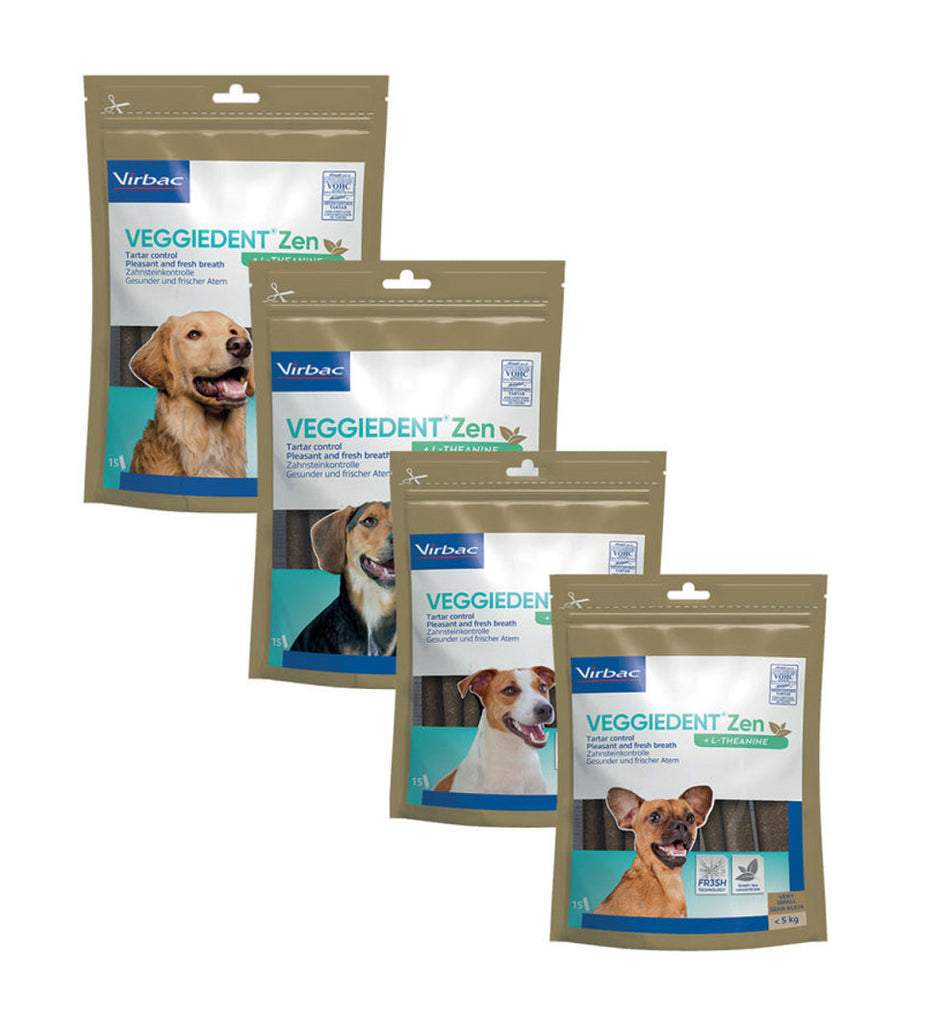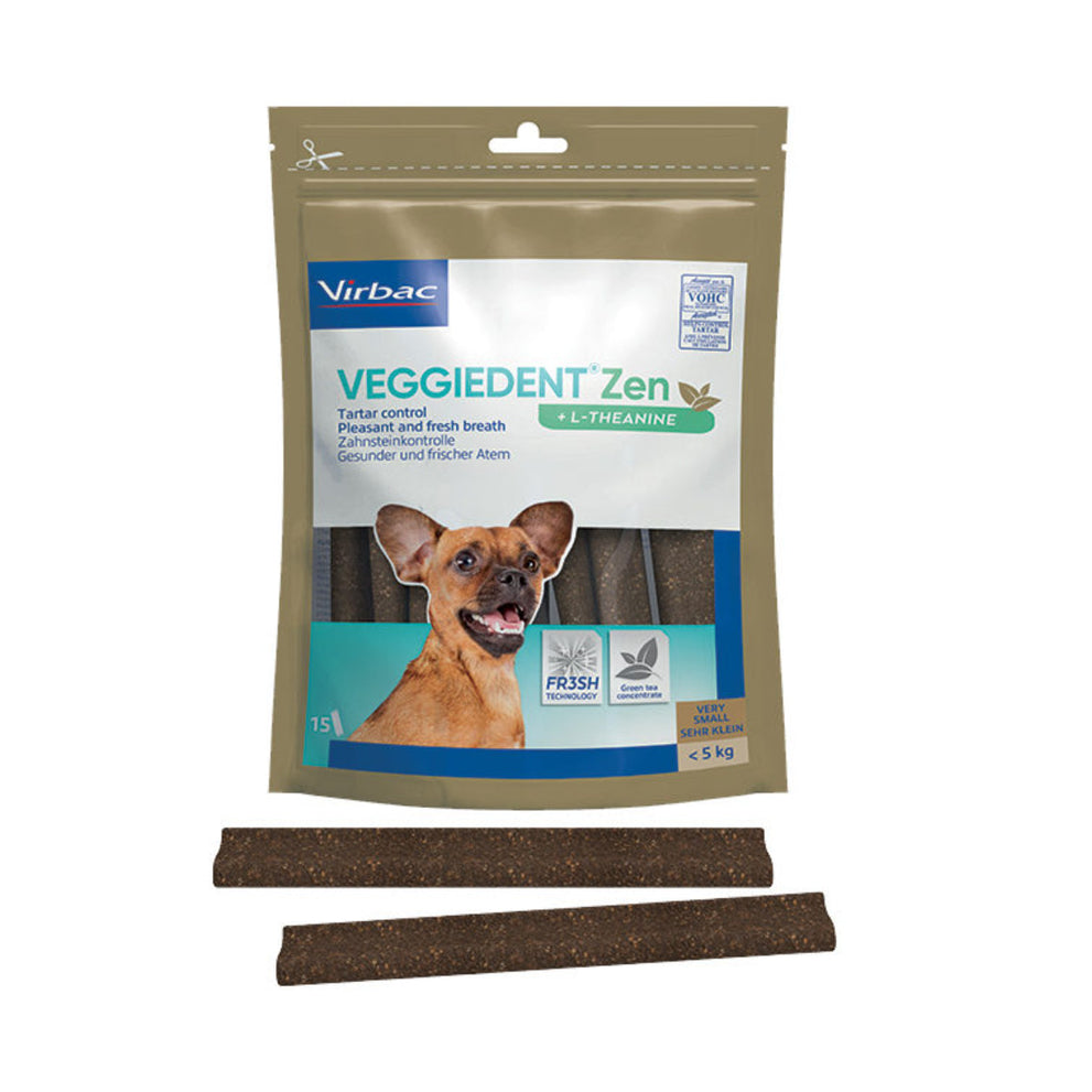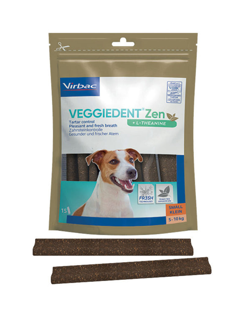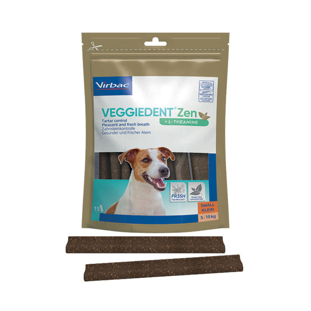 VeggieDent FR3SH Zen is een kauwstrip voor de dagelijkse gebitsreiniging bij honden. Het voorkomt de vorming van tandplak, tandsteen en slechte adem. Daarnaast bevat de Veggiedenkt FR3SH Zen L-theanine. Dit is een aminozuur dat gewonnen wordt uit groene thee. Het vermindert reacties in relatie tot stress en angst en bevordert de leercapaciteit. L-theanine is gekend om zijn ontspannende eigenschappen.