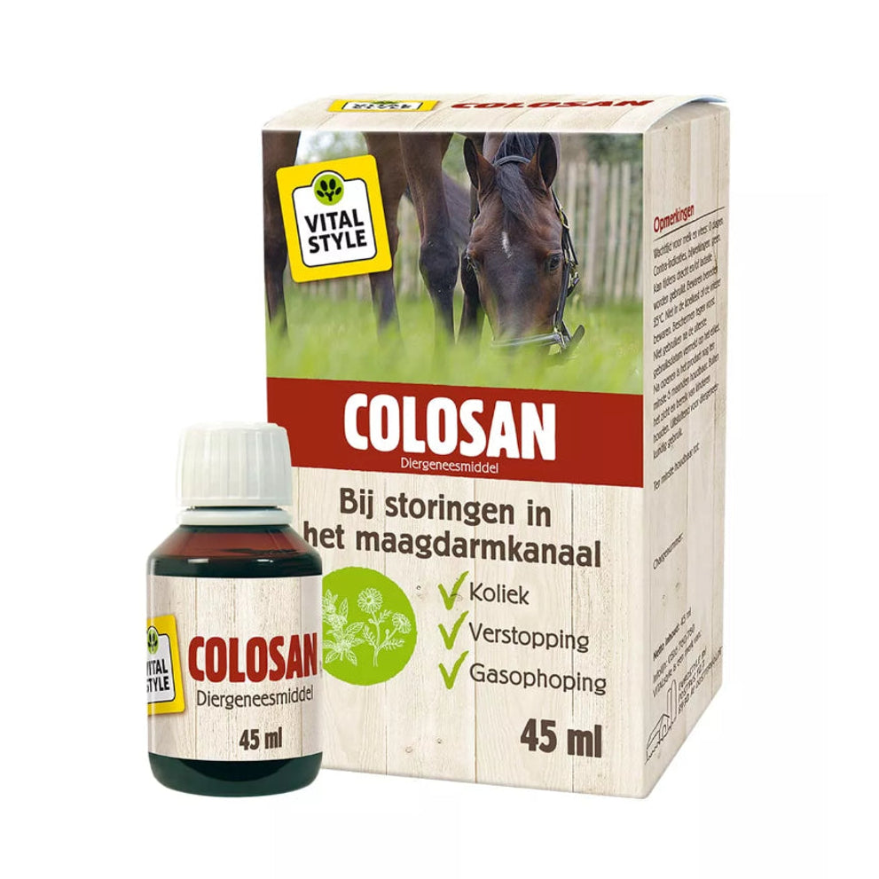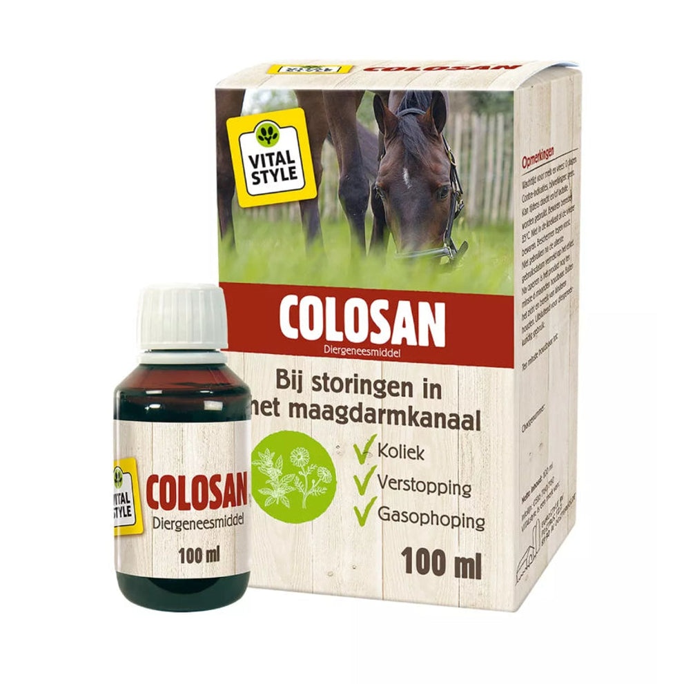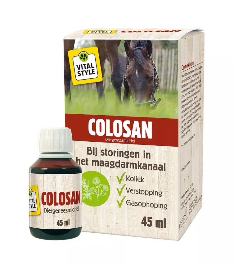 Colosan van VITAstyle is een natuurlijk middel dat ingezet kan worden ter ondersteuning van storingen in het maagdarmkanaal bij paarden zoals koliek, gasophopingen en verstoppingen. Het werkt krampstillend en gasafdrijvend en zorgt zo snel voor verlichting.