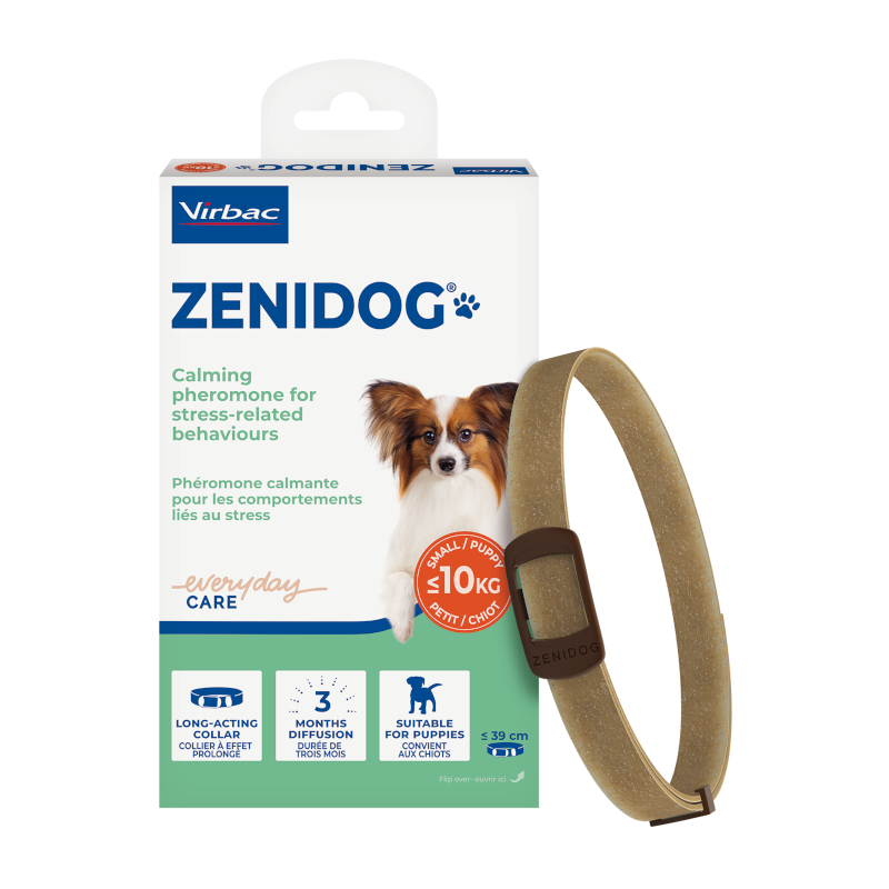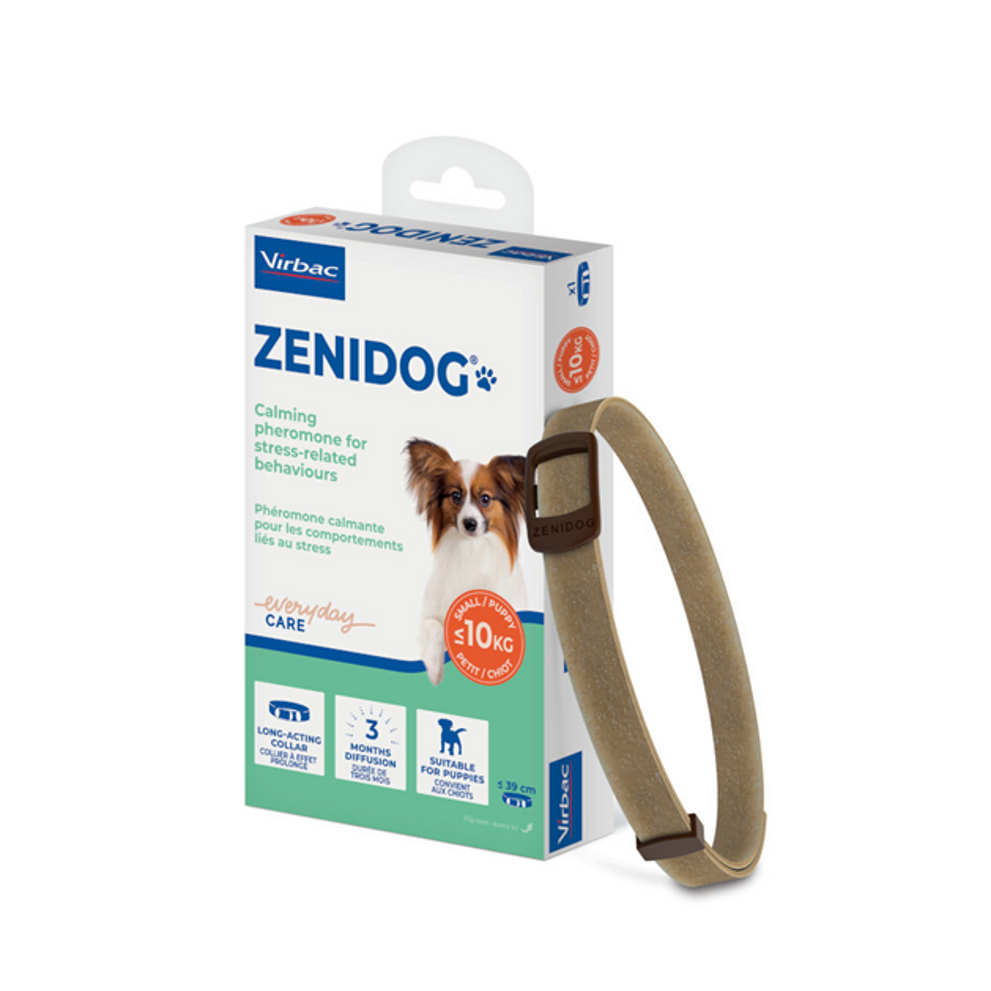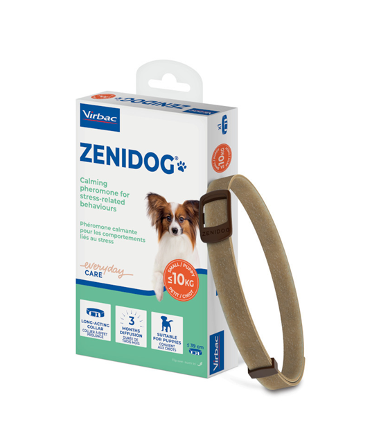 De Zenidog Halsband van Virbac is een langwerkende feromonenhalsband voor honden die helpt stressgerelateerd gedrag te verminderen. Het bevat een geruststellend feromoon voor honden, met een werkzaamheid tot 3 maanden.