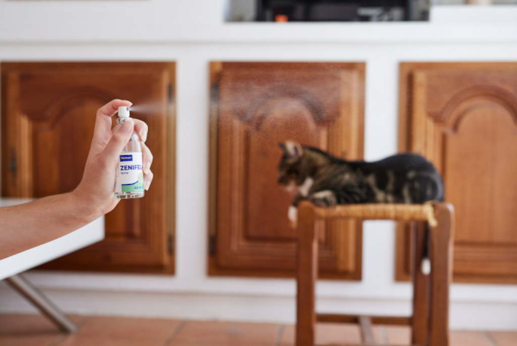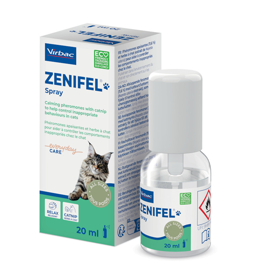 Zenifel spray is een kalmerende spray die je op specifieke plekken kunt gebruiken voor kortdurende situaties. Denk bijvoorbeeld aan de reismand voor onderweg of voor een bezoek aan de dierenarts. Het bevat gezichtsferomonen van katten en kattenkruidextract om hen gerust te stellen als zij veel stress ervaren.